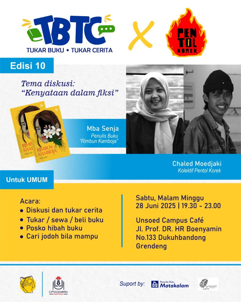 Kini TBTC sudah edisi ke 10. Berkolaborasi dengan Kolektif Pentol Korek, TBTC menghadirkan diskusi dengan tajuk “Kenyataan dalam fiksi”. Acara tersebut merupakan road to dari peluncurkan buku “Rimbun Kamboja” karya Kalasenja –nama pena—yang diterbitkan oleh Matakalam.