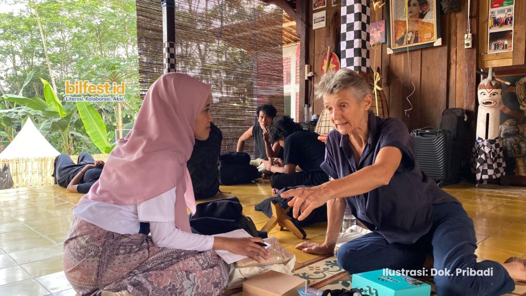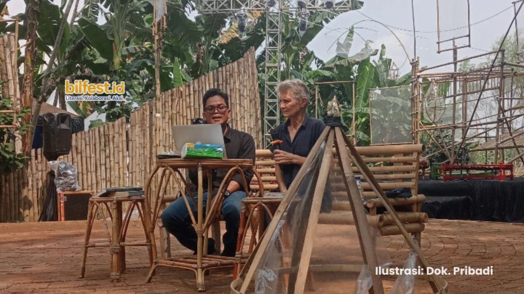 Sore itu aku hanya bersama seorang rekan tim dari BIL Fest. Obrolan yang tidak sampai lima menit bersama Ibu Elizabeth itu meninggalkan impresi pertama yang menyenangkan tentangnya bagiku. Beliau bercerita baru saja sampai sore itu di lokasi berlangsungnya Bisik Serayu Festival 2025, beliau menceritakan kesan pertamanya yang seperti cepat merasa dekat dengan semuanya, rasanya sangat menyenangkan seolah sudah lama berbaur. Mataku tidak lepas memperhatikan beliau sampai rekanku menyerahkan sepotong stiker bilfest.id kepadanya. Beliau menerima stiker sebesar jari orang dewasa itu sambil bertanya, “Apa itu BIL Fest?”