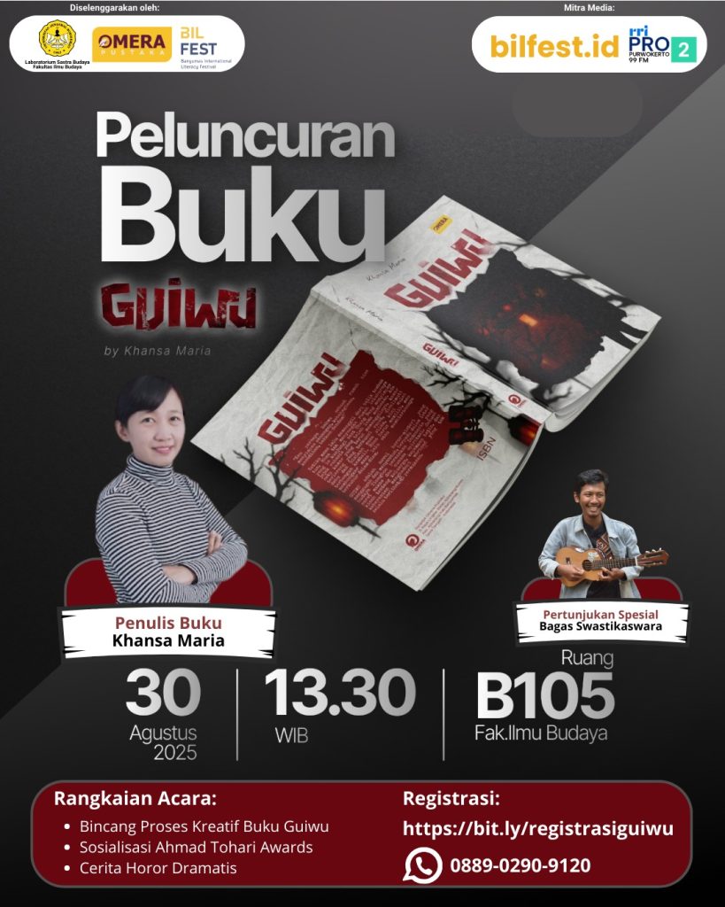 Pada siang hari yang cukup kelabu dengan awan keabu-abuan. Tepatnya pada Sabtu tanggal 30 Agustus 2025. Digelarnya serangkaian acara bertajuk “Peluncuran Buku Guiwu” karya Khansa Maria di ruang B105 Fakultas Ilmu Budaya Universitas Jenderal Soedirman. Sebagaimana yang terungkap pada sinopsis buku Guiwu, ini “Adalah novel horor-misteri yang menggugah dan menyentuh, berpadu dalam latar budaya Tionghoa peranakan Indonesia yang sarat makna dan nuansa spiritual. Sebuah kisah tentang keluarga, kepekaan batin, dan keberanian menghadapi warisan yang tak selalu terlihat di permukaan.”