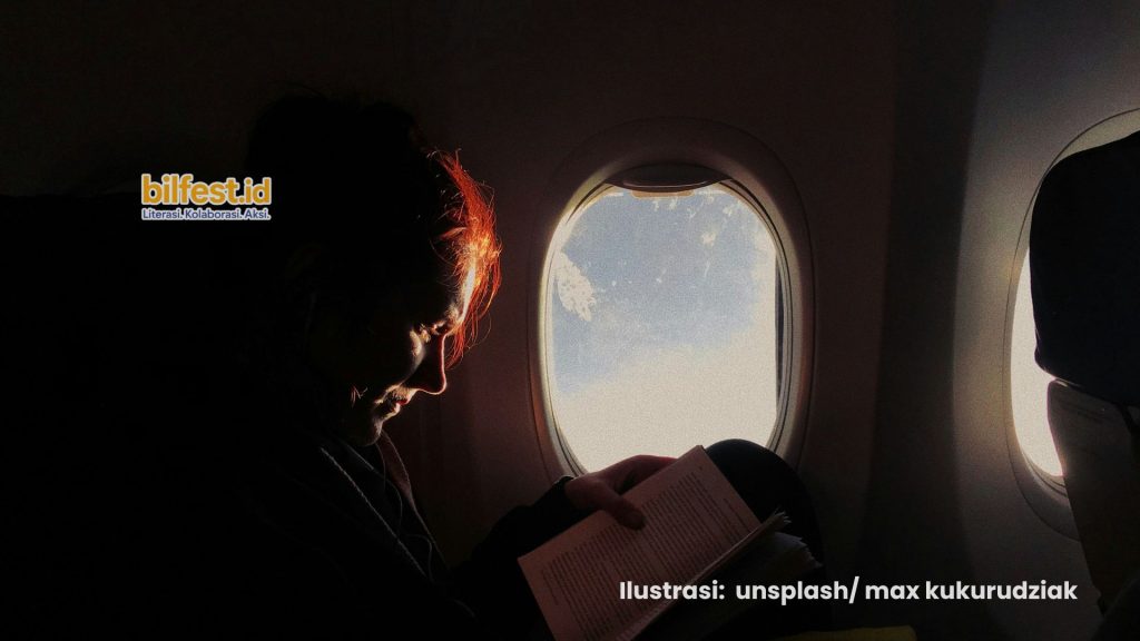 “Memang ada yang membaca buku di langit?”, tanyaku sambil tetap membolak-balik buku bersampul biru itu.