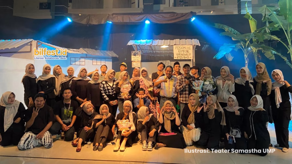 Naskah itu -“Dilarang Menyanyi di Kamar Mandi”- memiliki kedekatan tersendiri bagiku karena pernah menjadi bahan analisis penugasan di suatu perkuliahan sebelum aku dan teman-temanku masuk ke kelas penjurusan. Jadi bisa dikatakan naskah ini adalah salah satu naskah yang dibahas ramai-ramai seangkatan ketika aku dan teman-temanku masih berada di semester muda. Bahkan di tanggal 23 Desember 2025, paginya sebelum menonton pementasan di malam hari, aku mengirim pesan WhatsApp ke dosenku dulu untuk memastikan ingatanku soal tugas analisis “Dilarang Menyanyi di Kamar Mandi”. Rasa antusiasku itu juga yang membuatku hadir di UMP sebelum waktu Magrib, jauh sebelum pukul 18.30 seperti yang tertera di undangan, jauh sebelum pementasan dimulai.