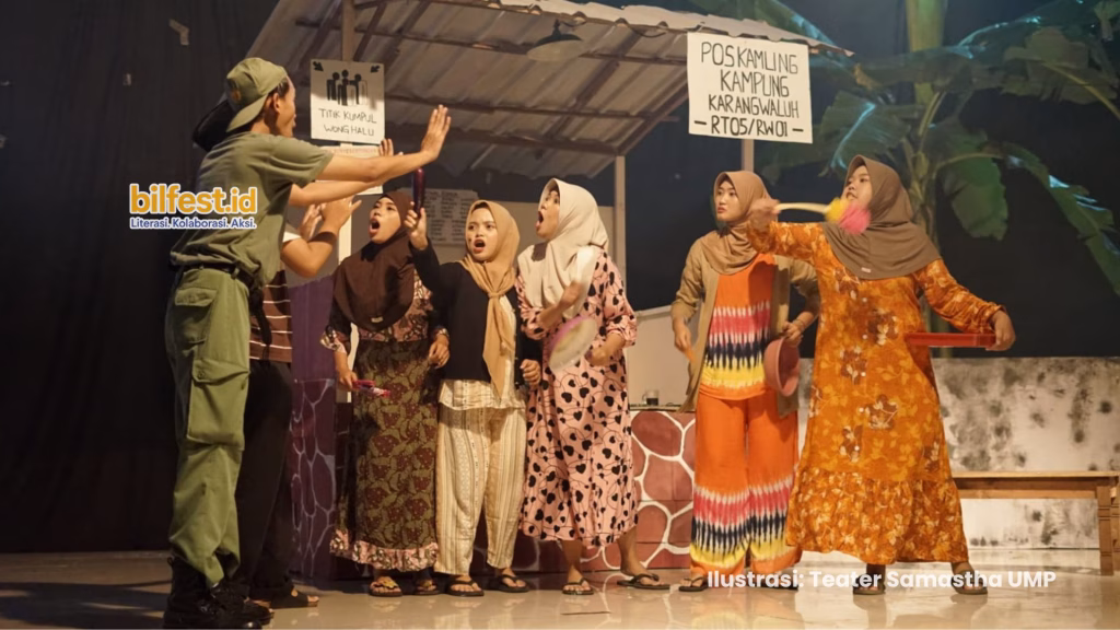 Buatku proses adaptasi tersebut cukup berhasil jika tujuan Teater Samastha agar terkesan lebih dekat dengan situasi dan kondisi masyarakat saat ini. Latar waktu 2025 tersebut sangat terasa saat gerombolan ibu-ibu kampung pada pementasan tersebut bergosip dan muncul punchline berupa kata “deym!!” (bahasa gaul atau slang dari salah satu kata dalam bahasa Inggris yaitu damn) yang diucapkan bersamaan sampai mengundang tawa penonton. Penonton yang aktif menjadi warga sosial media pasti related dengan punchline yang sukses dibawakan secara kocak dan dramatis tersebut. Apalagi penamaan Kos Dukuh Waduh yang sepertinya terinspirasi dari Dukuhwaluh, lokasi berdirinya Universitas Muhammadiyah Purwokerto, atau Pos Kamling Kampung Karang Waluh, yang menurutku juga terinspirasi dari penamaan Dukuhwaluh serta kebanyakan daerah di Banyumas yang penamaannya diawali kata “Karang” (seperti Karanglewas, Karangnangka, Karangnanas, dan lain-lain). Bagi penonton yang merupakan warga Banyumas mungkin melihat penamaan latar-latar ini seperti menemukan kedekatan tersendiri bahkan seperti jokes internal. Semua semakin mengesankan ketika “Dilarang Menyanyi di Kamar Mandi” yang sudah diadaptasi tersebut secara jenaka dimainkan oleh para aktornya yang memainkan peran sebagai Monica, Pak RT, Hansip, Arul, Bagus, Yani (istri Arul), Susi (istri Bagus), Erma, Minah, dan Atun.
